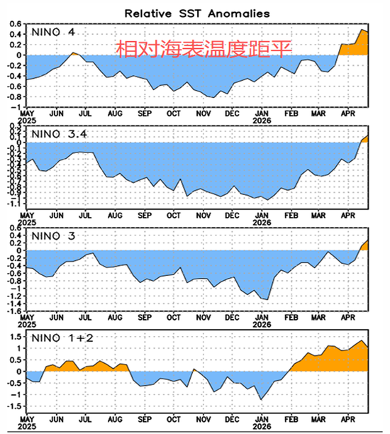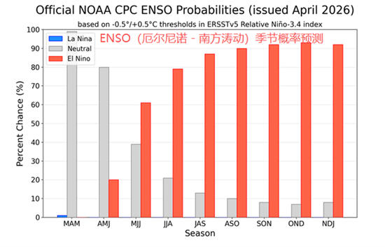 未来路径:2026年4–6月维持ENSO中性概率80%。2026年5–7月:厄尔尼诺开始形成概率61%。2026年下半年–年底:厄尔尼诺持续并可能增强,至少维持到2026年底。强度提示:不排除发展为强厄尔尼诺(Nino-3.4 ≥+2.0℃),概率约1/4,取决于夏季赤道西风异常能否持续。